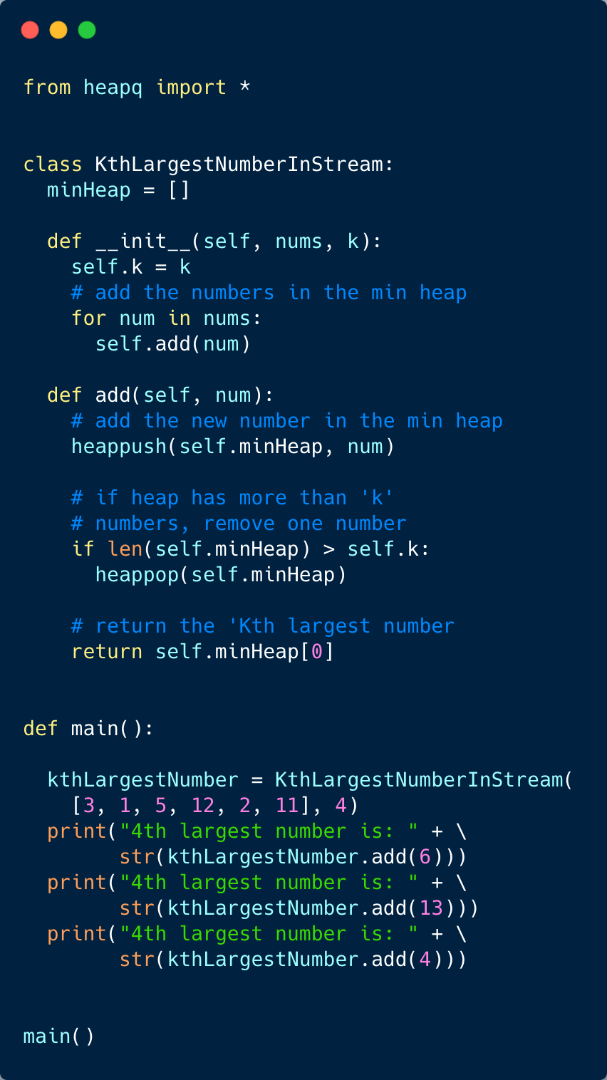 This will ensure that we always have ‘K’ largest numbers in the heap. The most efficient way to repeatedly find the smallest number among a set of numbers will be to use a min-heap. As we know, we can find the smallest number in a min-heap in constant time O(1), since the smallest number is always at the root of the heap. Extracting the smallest number from a min-heap will take O(logN) (if the heap has ‘N’ elements) as the heap needs to readjust after the removal of an element.