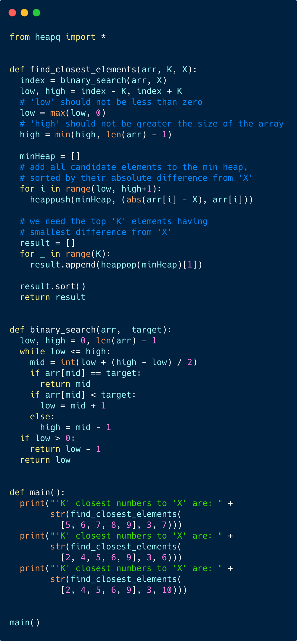 The time complexity of the above algorithm is O(logN + K). We need O(logN) for Binary Search and O(K) for finding the ‘K’ closest numbers using the two pointers.