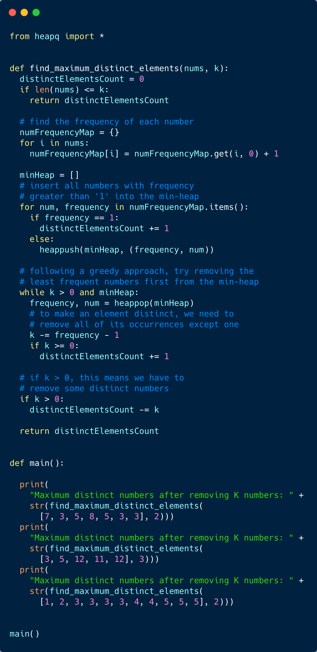 Given an array of numbers and a number ‘K’, we need to remove ‘K’ numbers from the array such that we are left with maximum distinct numbers.