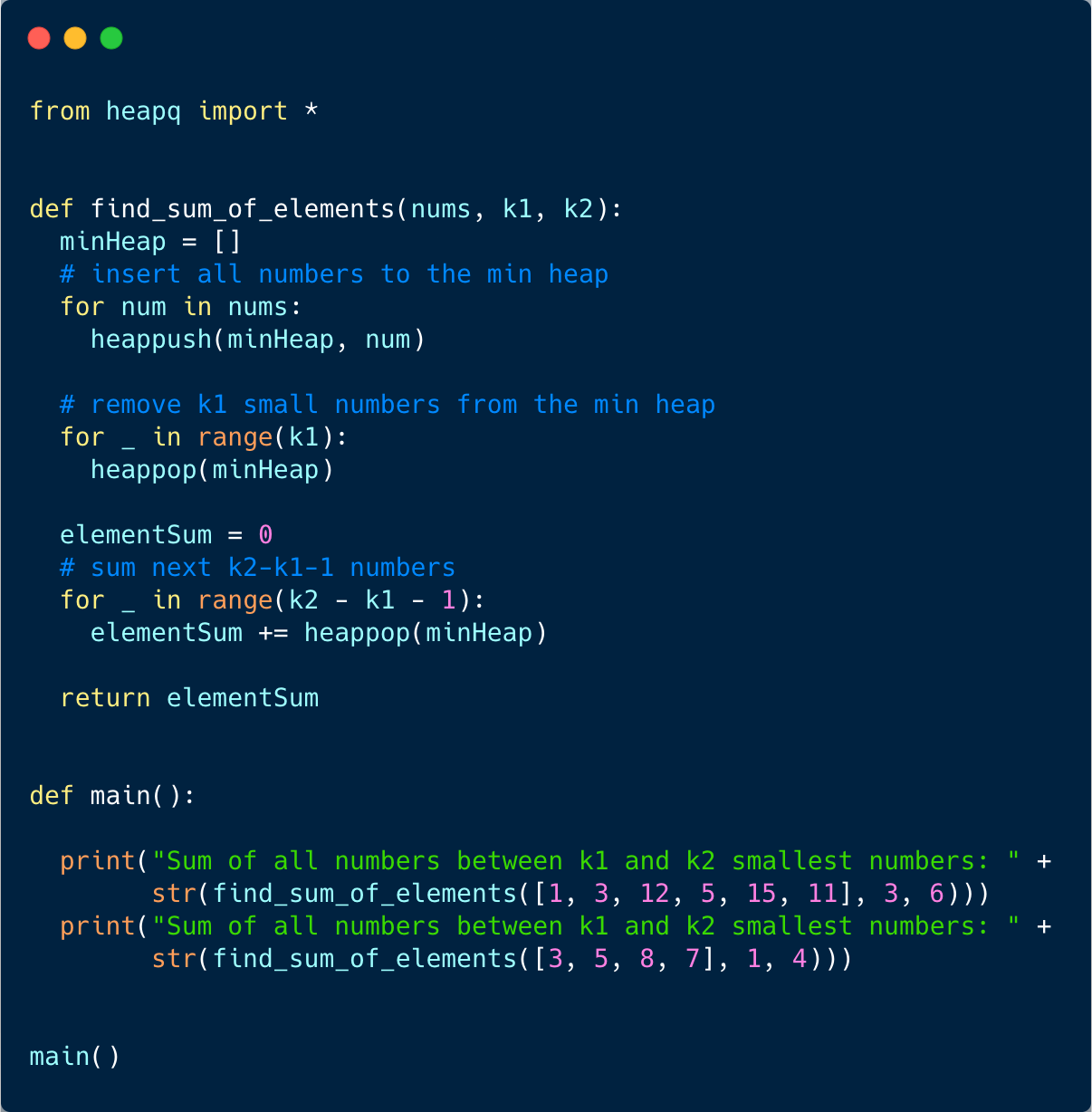 3. Now take the next K2-K1-1 numbers out of the heap and add them. This sum will be our required output.