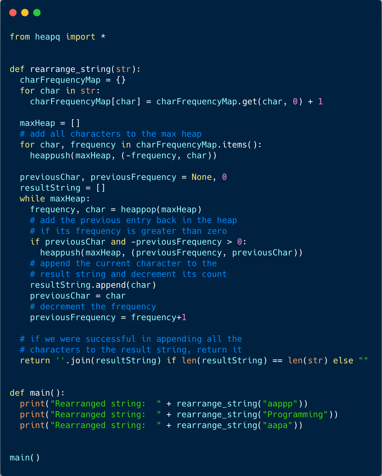 This problem follows the Top ‘K’ Numbers pattern. We can follow a greedy approach to find an arrangement of the given string where no two same characters come next to each other.