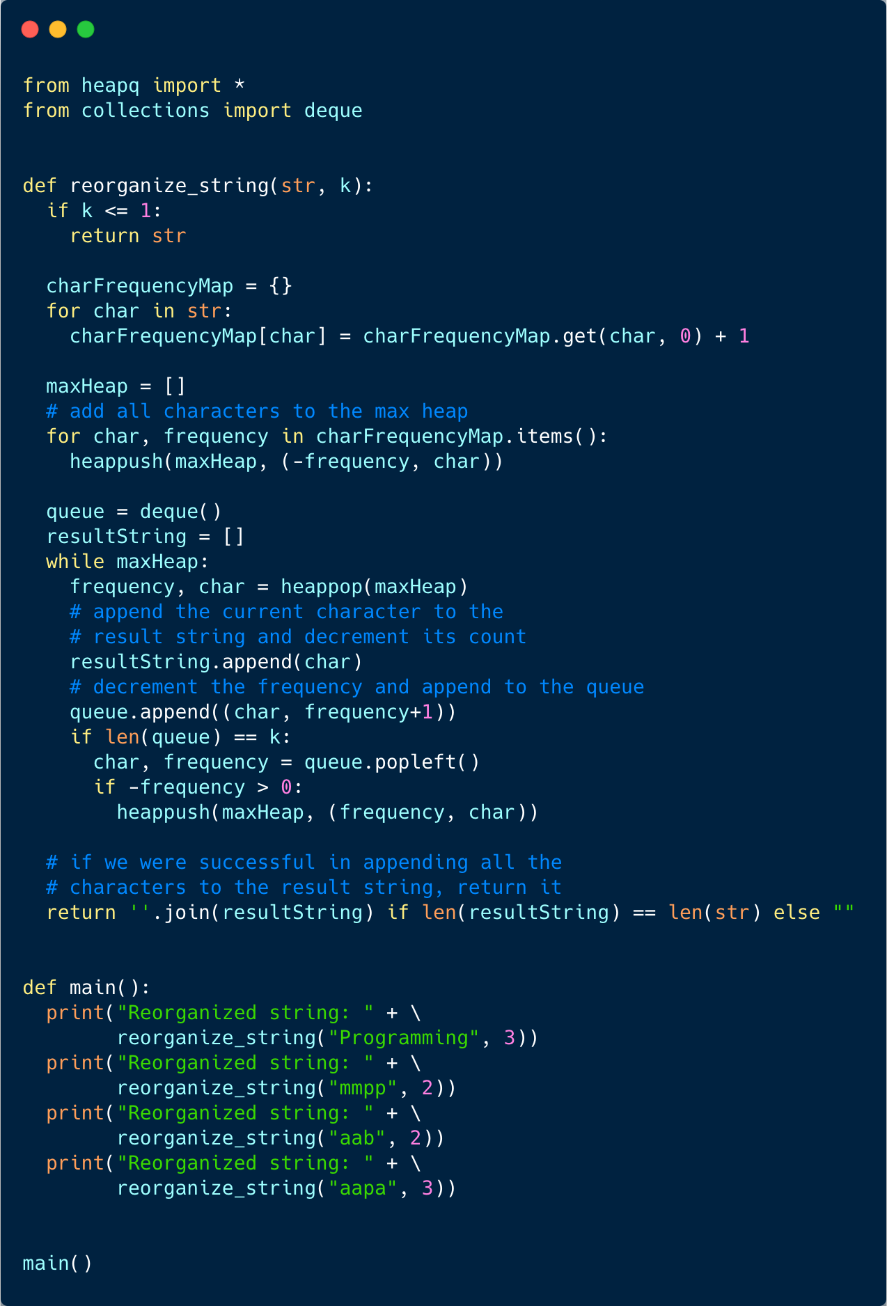 Following a similar approach, since we were inserting a character back in the heap in the next iteration, in this problem, we will re-insert the character after ‘K’ iterations. We can keep track of previous characters in a queue to insert them back in the heap after ‘K’ iterations.