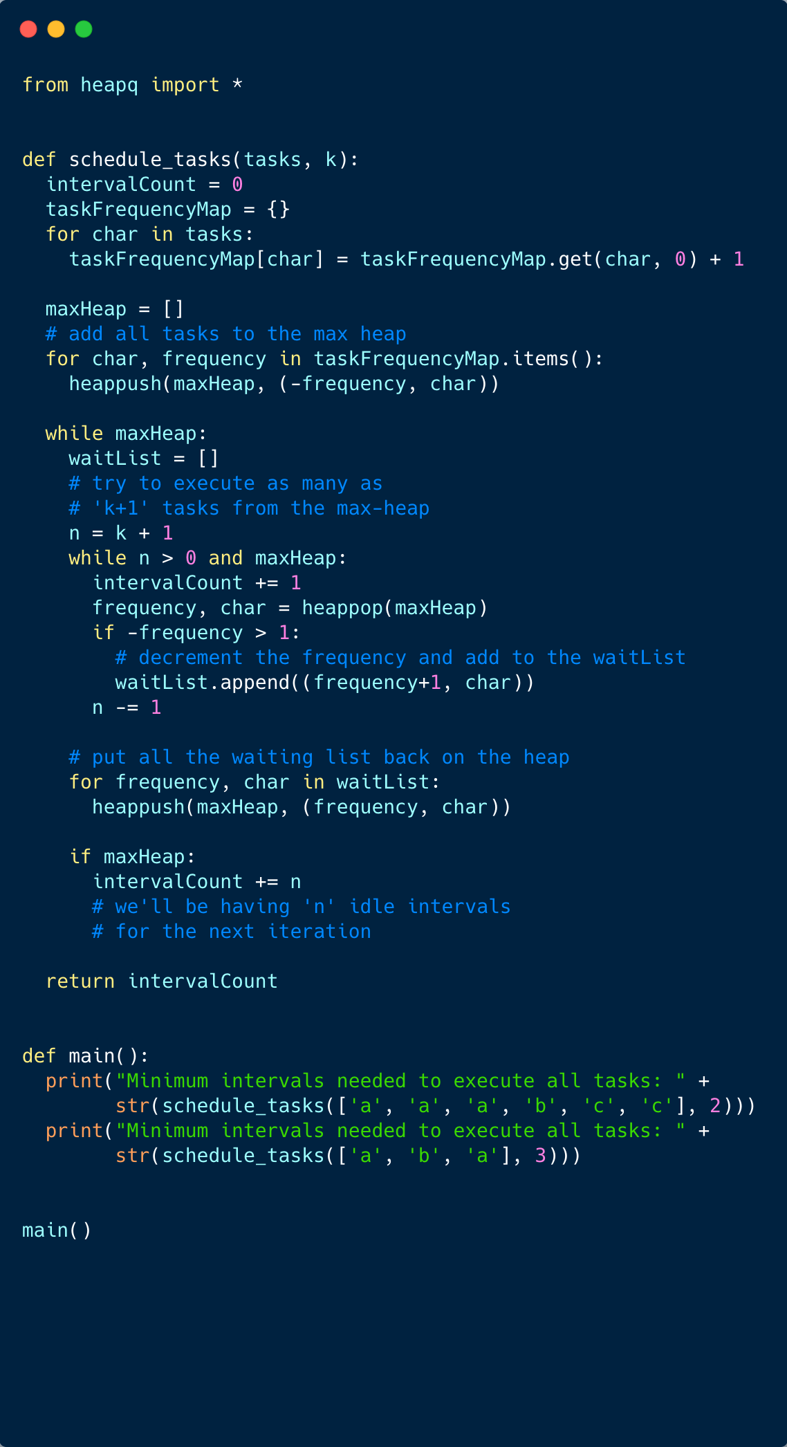 Following a similar approach, we will use a Max Heap to execute the highest frequency task first. After executing a task we decrease its frequency and put it in a waiting list. In each iteration, we will try to execute as many as k+1 tasks. For the next iteration, we will put all the waiting tasks back in the Max Heap. If, for any iteration, we are not able to execute k+1 tasks, the CPU has to remain idle for the remaining time in the next iteration.