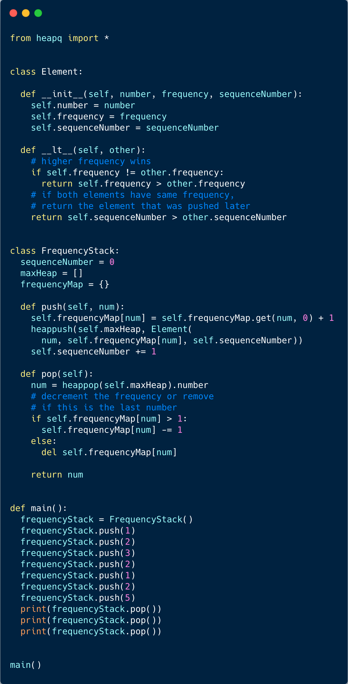 2. If two numbers have the same frequency, we will need to return the number which was pushed later while popping. To resolve this, we need to attach a sequence number to every number to know which number came first.