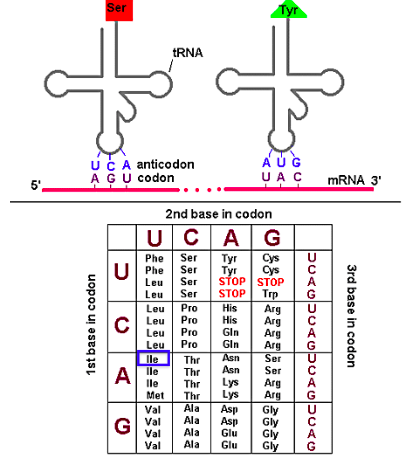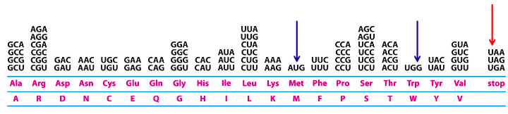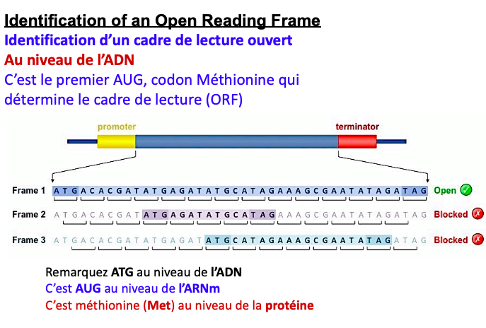 Le premier AUG (Méthionine) est un codon initiateur. Il détermine le site d’initiation du cadre de lecture (la phase de lecture), qui se termine au stop (UAA, UAG, UGA).