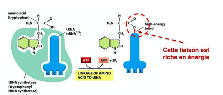 Comment est-ce qu’on lie l’aa à l’ARNt synthétase? En hydrolysant de l’ATP en AMP (voir image).