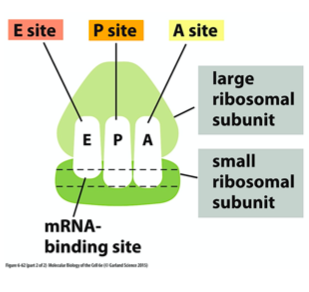 3 sites de liaison aux ARNt: A pour aminoacyl-ARNt ou accepteur, P pour site peptidyl-ARNt et E pour exit (site de sortie).