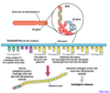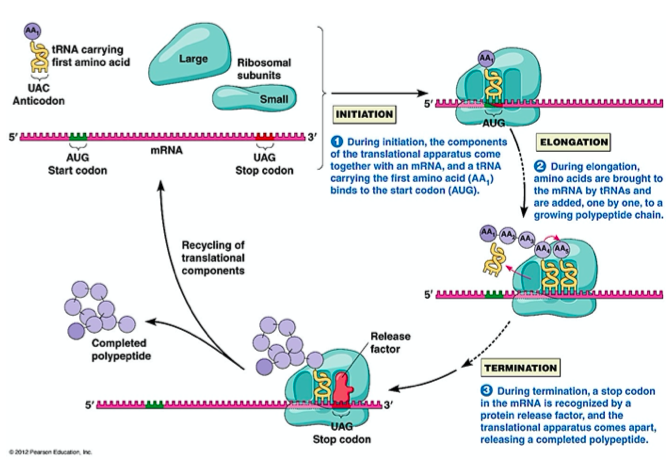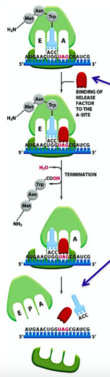 1) Un ARNt chargé se lie au site A libre du ribosome selon le codon sur l’ARNm. Ce codon détermine l’aa ajouté à la chaine polypeptidique en croissance. Les sites A et P sont assez proches pour que deux ARNt s’apparient à deux codons successifs. Cet arrangement ajusté permet qu’il n’y ait pas d’erreur de lecture pendant toute la synthèse.