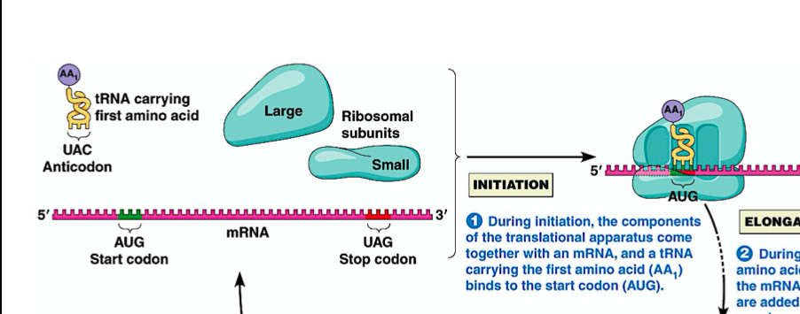 Petite sous-unité se lie à la coiffe et glisse jusqu’à un codon AUG. La grosse sous-unité se lie alors et l’élongation commence.