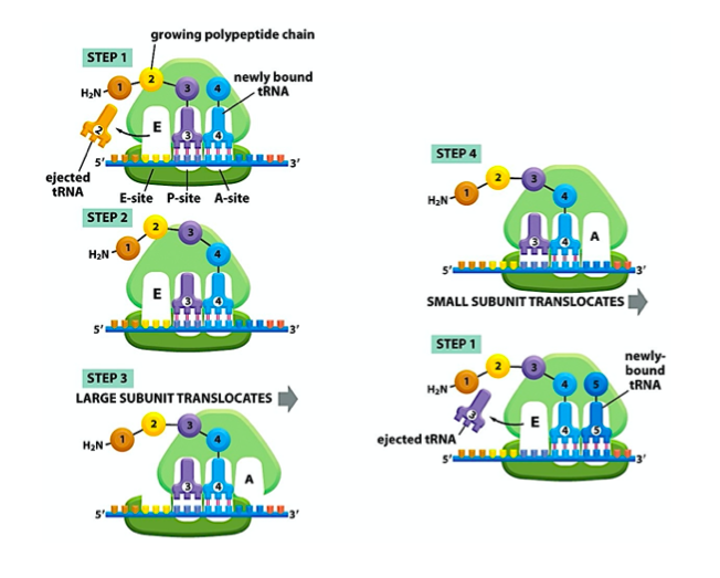 4) La petite sous-unité se déplace exactement 3 nucléotides sur la molécule d’ARNm, ce qui la repositionne exactement en face de la grande sous-unité en positions originales l’une par rapport à l’autre. Le site A est ainsi libre pour accueillir l’ARNt chargé suivant.