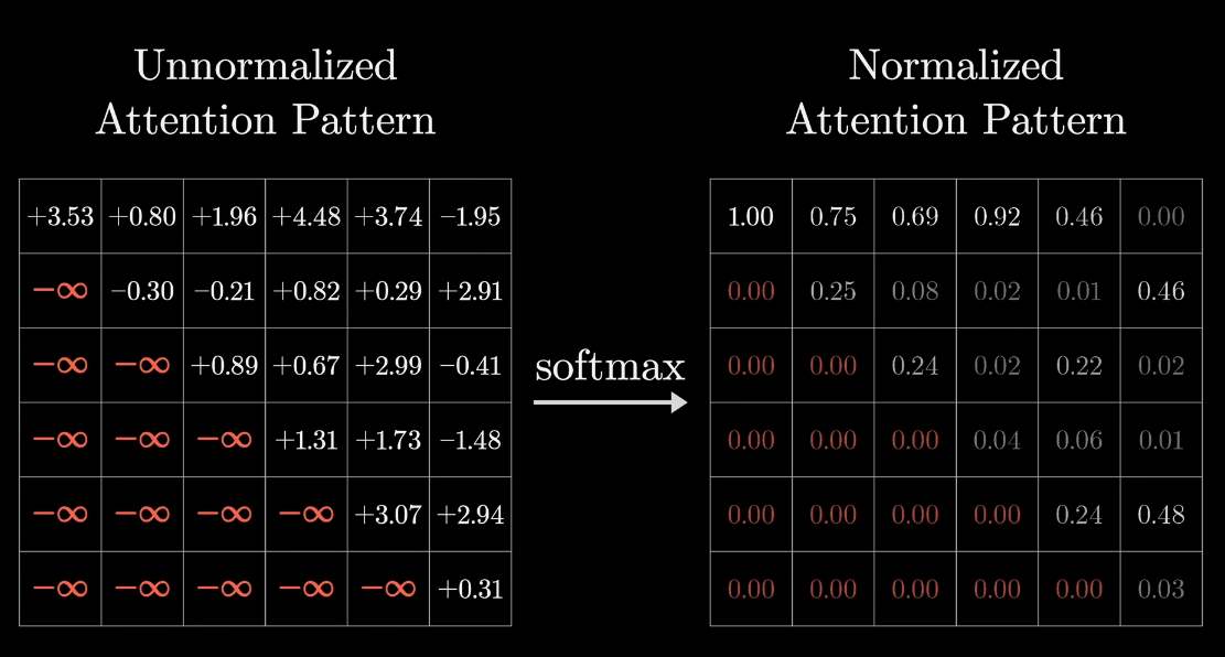 We pass them through a softmax (within the transformer block, not just at the end of the network), so basically the dot products that are negative and around zero go to nothing, and the large positive magnitudes are the ones that matter. These are the ones that show words that “attend to” other words.