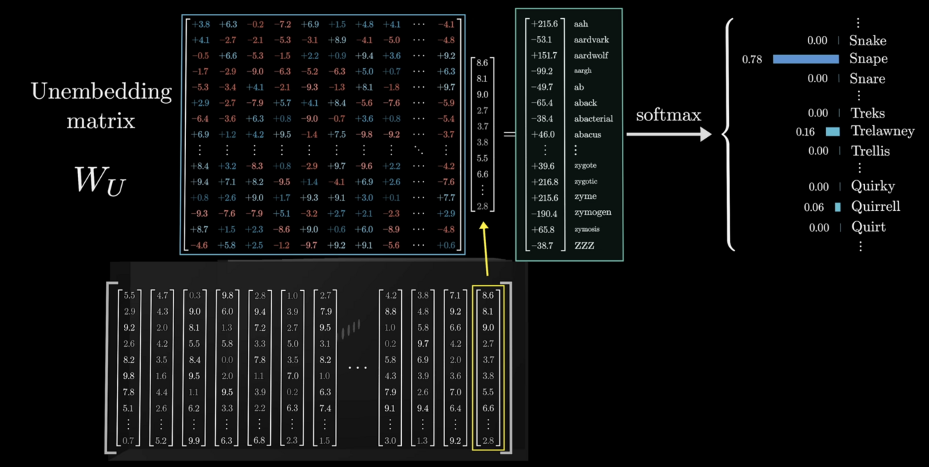 An unembedding matrix takes the last contextual word embedding in the sequence, which is what GPT uses to predict the next word, and maps it to a vector with length equal to the vocabulary size, where the scalars are logits for which word is best to predict next. That’s then passed through a softmax to get predictions.