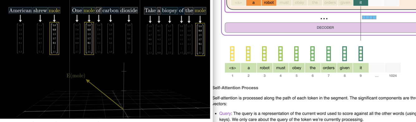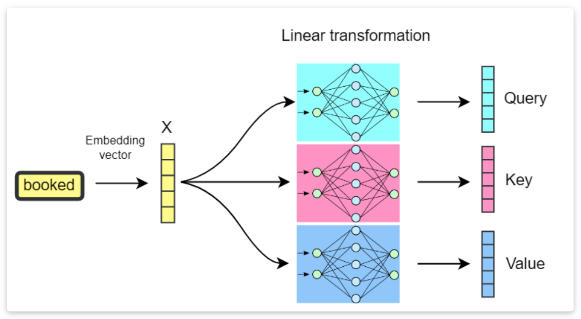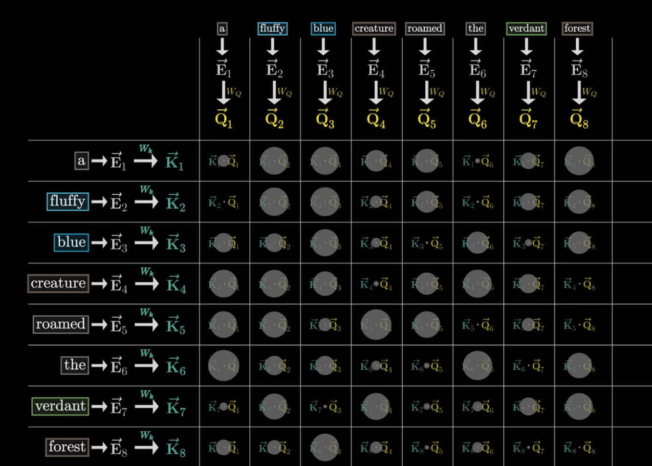 The qs, or queries, can be thought of as “the input word asking a question, that it can use to better contextually embed itself.” Like “are there any adjectives modifying me?”