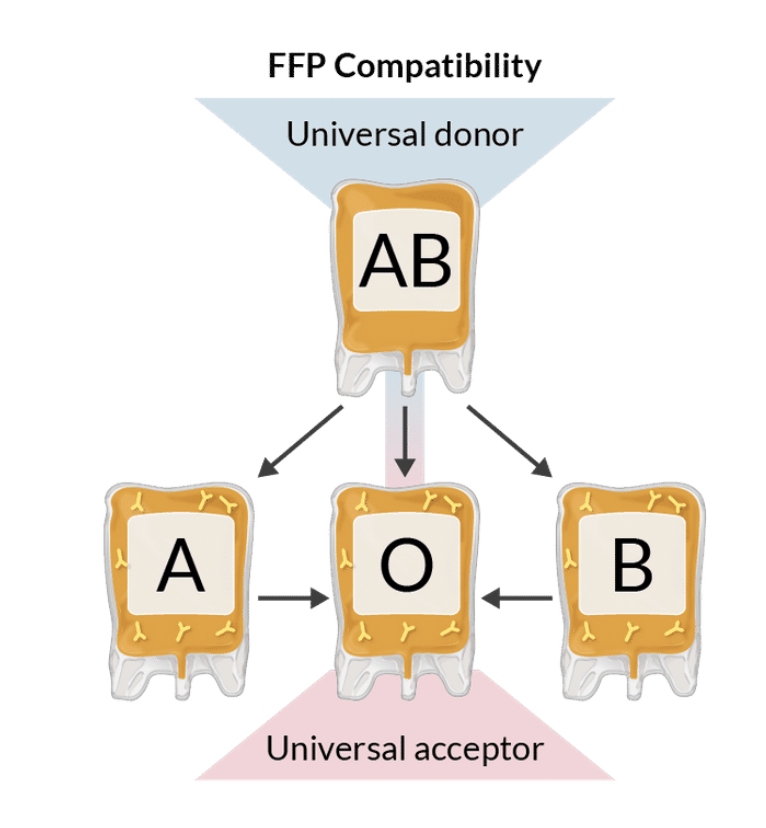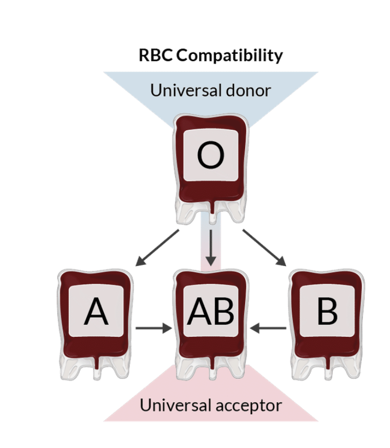 O(-). contains anti an anti b and rh antigens (aka no antibodies) so other blood types with these antigens won’t cause problems