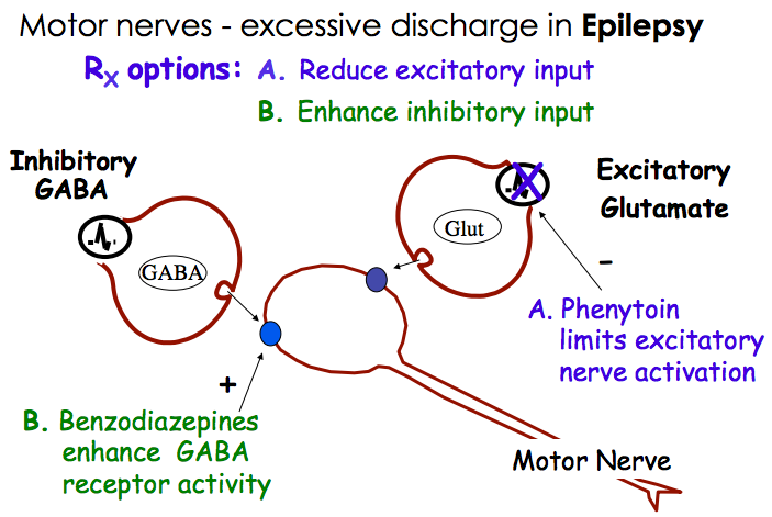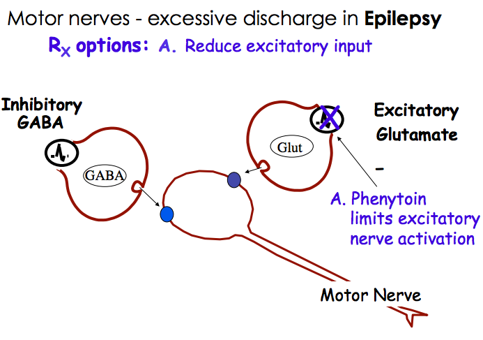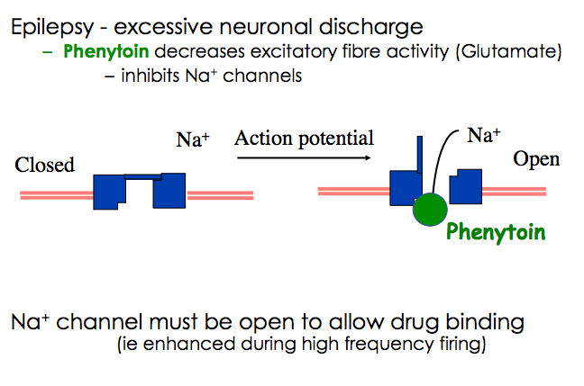 Decreases excitatory fibre activity (glutamate) by inhibiting Na channels