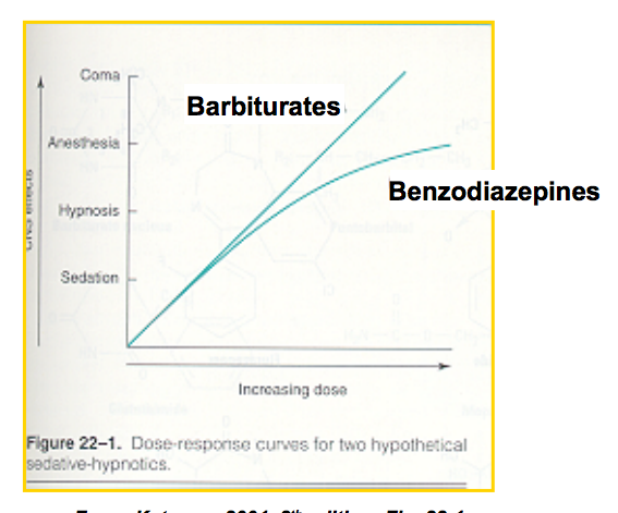 Why are benzodiazepines considered safe in overdose, whereas barbiturates are not?