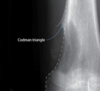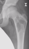 Aumento del tamaño en pocos meses de una masa descubierta hace 15 años. En la radiografía simple se aprecia una masa sesil que nace de la región posterior del fémur de unos 5 cm de diámetro, irregular, con calcificaciones dispersas