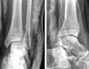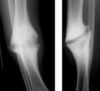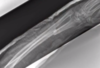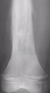 Paciente de 15 años que presenta dolor y tumefacción en pierna izquierda, de dos meses de evolución, sin antecedentes traumáticos ni de otro tipo. Radiológicamente se observa reacción perióstica que afecta a la práctica totalidad de la diáfisis del peroné en forma de capas de cebolla, así como espículas radiadas a partir del córtex óseo en forma de púas de peine.