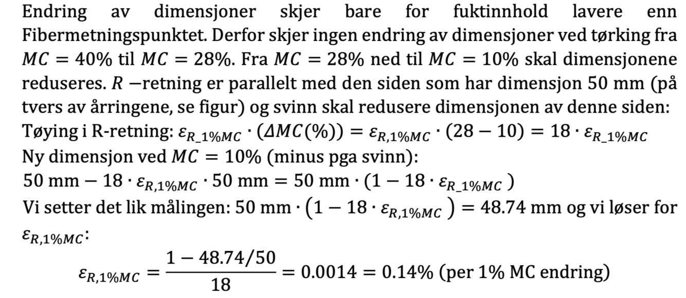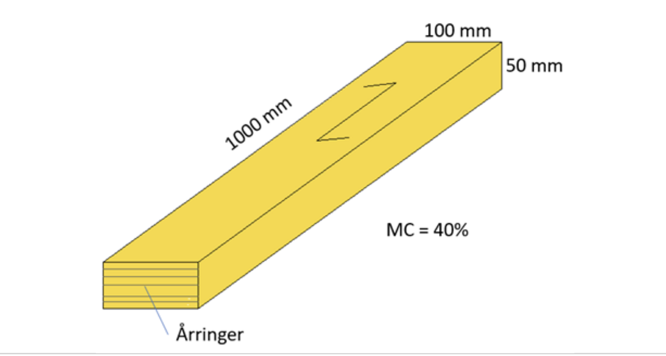 Figuren viser et trebord med fuktinnhold 40% og dimensjoner 50×100×1000 mm3. Årringenes orientering er vist i figuren.