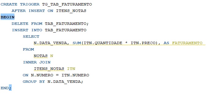 Insere novos registros na tabela TAB_FATURAMENTO, calculando o faturamento a partir das tabelas NOTAS e ITENS_NOTAS. A consulta SELECT calcula o faturamento para cada data de venda, somando o produto da quantidade pelo preço dos itens.