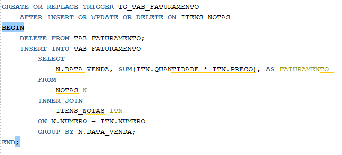 Explique o propósito do comando INSERT INTO TAB_FATURAMENTO … SELECT … dentro da TRIGGER.