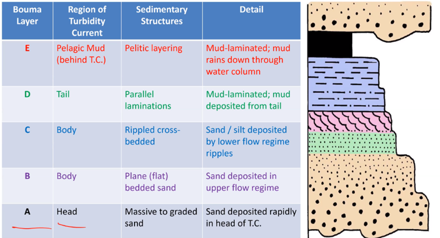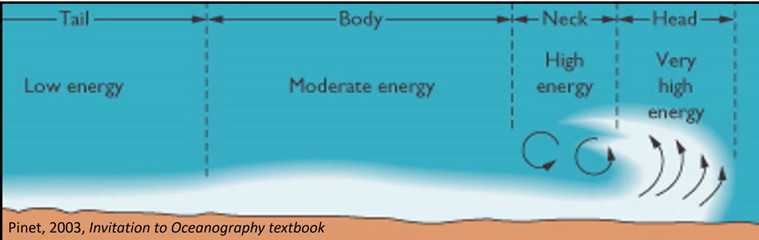 The Morphology of Turbidity Currents - draw a diagram and explain sediment deposits at each stage.