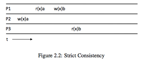 Strict Consistency means that any read on a resource x returns a value corresponding to the result of the most recent write on x. This definition implicitly assumes the existence of absolute global time. Is Figure 2.2 strictly consistent? If yes, find a valid execution sequence to prove it. If not, give an explanation.