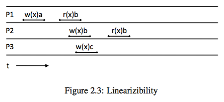 Linearizability means that all operations that are ordered in real-time are similarly ordered in the execution sequence. We assume ordering according to a set of synchronized clocks. This implies the operation can be executed at an arbitrary point within a given interval. Is Figure 2.3 lineralizable? Is Figure 2.3 strictly consistent, when neglecting the intervals? If yes, find valid execution sequences to prove it. If not, give an explanation.