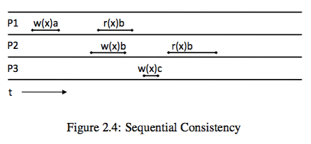 Sequential Consistency means that any valid interleaving of read and write operation is acceptable behavior, but all processes see the same interleaving of operations. Nothing is said about time. Is Figure 2.4 sequentially consistent? Is Figure 2.4 linearizable? If yes, find valid execution sequences to prove it. If not, give an explanation. Consider the intervals only to check linearizibility.