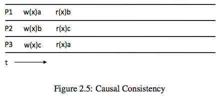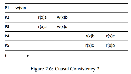 Causal consistency means that concurrent writes do not need to be seen in the same order by all readers. Causally related writes, however, must be seen in the same order by every process. This means processes can possibly have different execution sequences. Nothing is said about time. Is Figure 2.5 causally consistent? Is Figure 2.5 sequentially consistent? If yes, find valid execution sequences to prove it. If not, give an explanation.