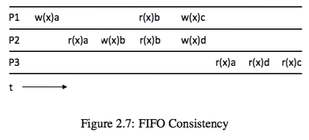 FIFO consistency means write operations by a single process are seen by all other processes in the order in which they were issued, but writes from different processes may be seen in different orders by different processes. Is Figure 2.7 FIFO consistent? Is Figure 2.7 causally consistent? If yes, find valid execution sequences to prove it. If not, give an explanation.