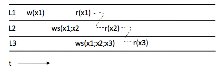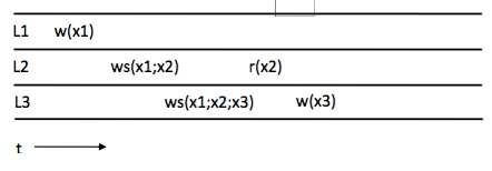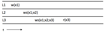 The write operation that led to the value read in L2 is not reflected at L3. Therefore, the situation is not writes-follow-read consistent. In order to correct the situation, w(x2) must be added to the write set at L3.