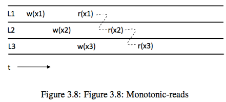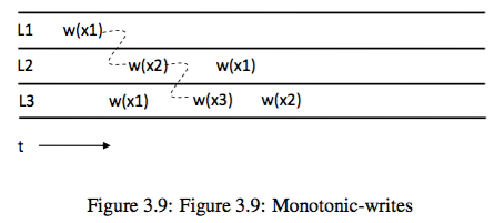 In fact the write to the replica at location L1 is reflected in the update operations at location L2 and L3. The problem here is that at L2 the writes are executed in the wrong order. Since writes in different orders can lead to different results, monotonic writes cannot be guaranteed.