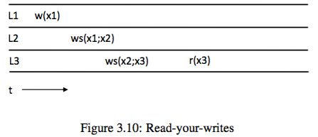 Read-your-writes means that the effect of a write operation by a process on data item x will always be seen by a successive read operation on x by the same process. Do you see any problems why read-your-writes in Figure 3.10 could not be guaranteed? If yes, how would you correct Figure 3.10?