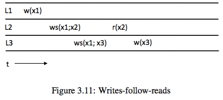 Writes-follow-reads means that a write operation by a process on a data item x following a previous read operation on x by the same process, is guaranteed to take place on the same or a more recent value of x that was read. Do you see any problems why writes-follow-reads in Figure 3.11 could not be guaranteed? If yes, how would you correct Figure 3.11?
