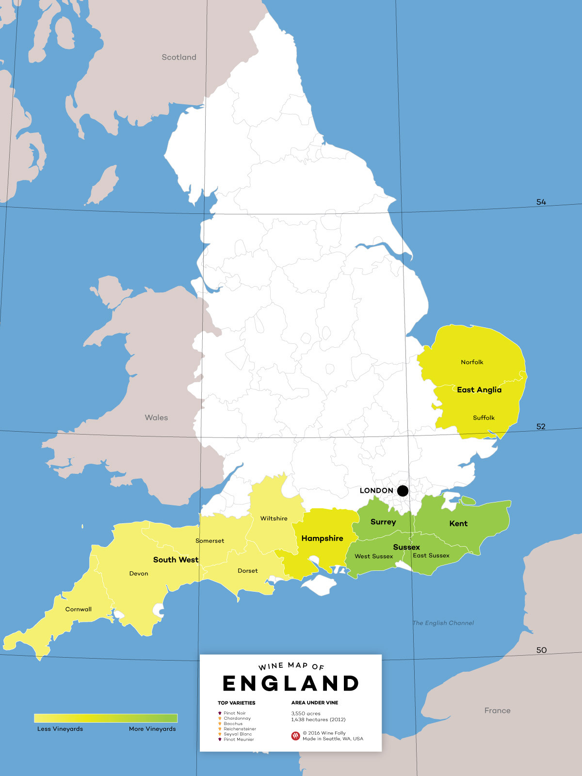 east of Sussex, across the English Channel from Calais. White Cliffs of Dover form the coastline of Kent. Warm climate compared to the rest of England. Same chalk limestone soil as Sussex.