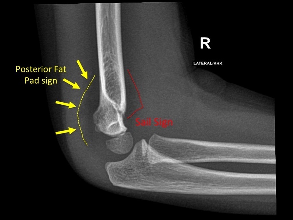 Joint effusion as anterior fat pad is elevated away from humerus –> intra-articular fracture