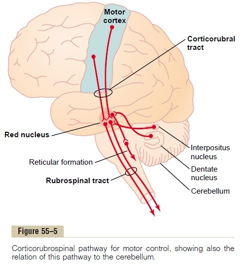 Basically think of the red nucleus as sending out a default “extend” signal to the body, which is overridden by cortical input.