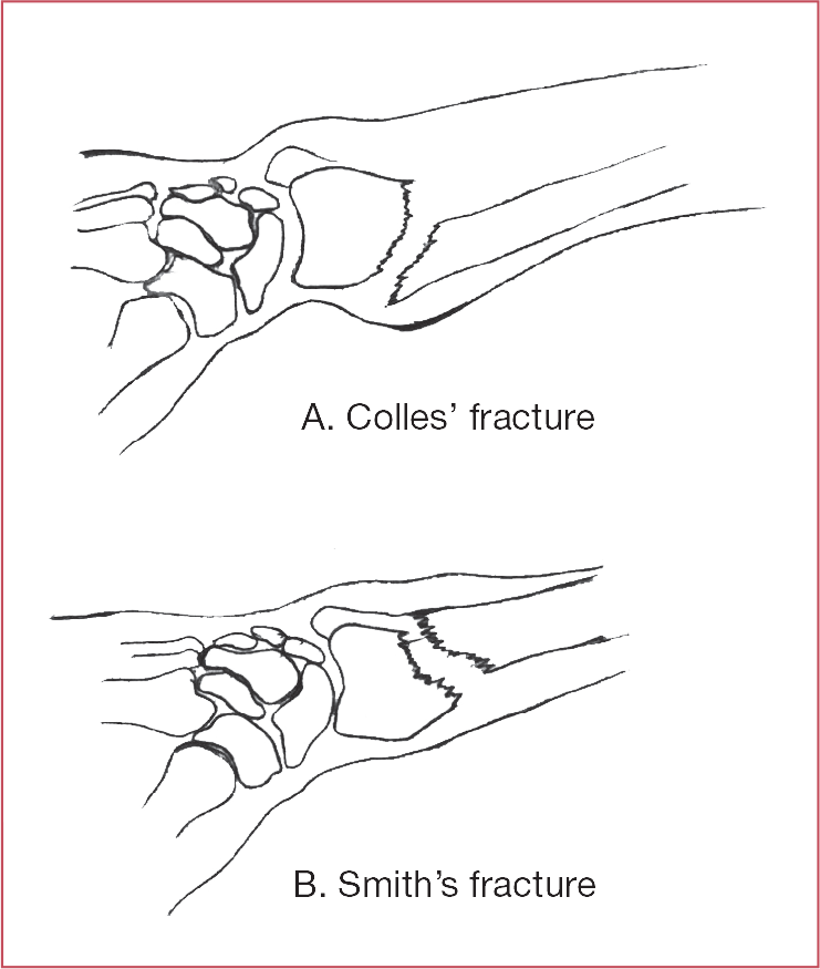 Distal radius fragment is dorsally displaced (CD). Associated with triangular fibrocartilage complex (TFCC) tears.