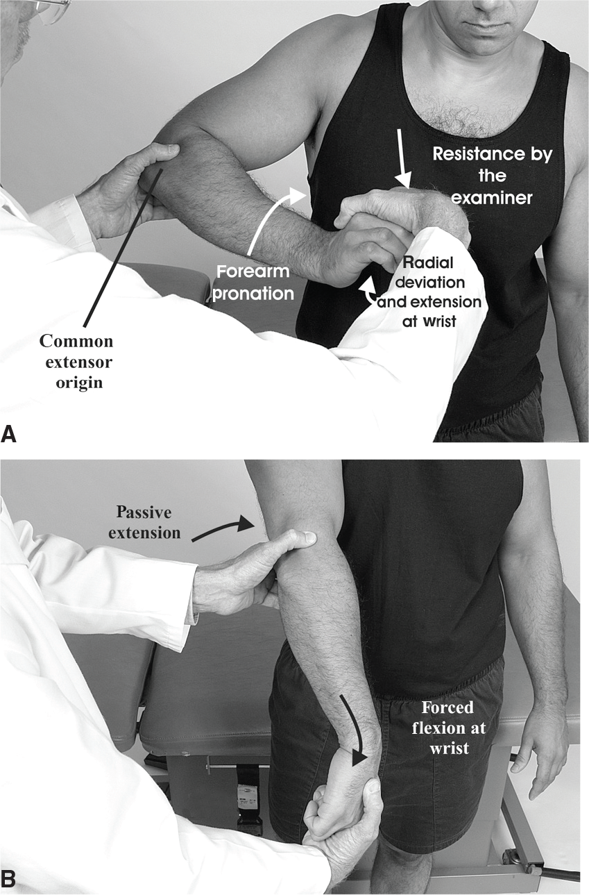 pain with palpation of common extensor tendon with resisted wrist extension (A)
