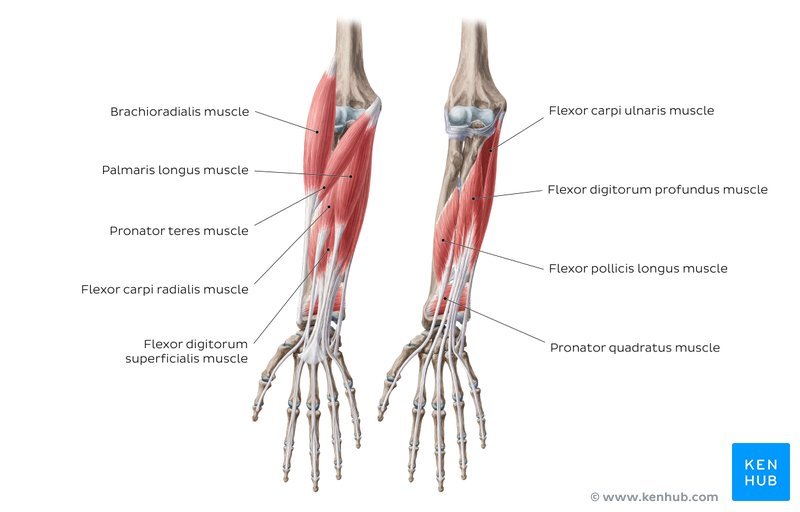 4 FDS tendons, 4 FDP tendons, FPL tendon, median nerve bordered by scaphoid and pisiform