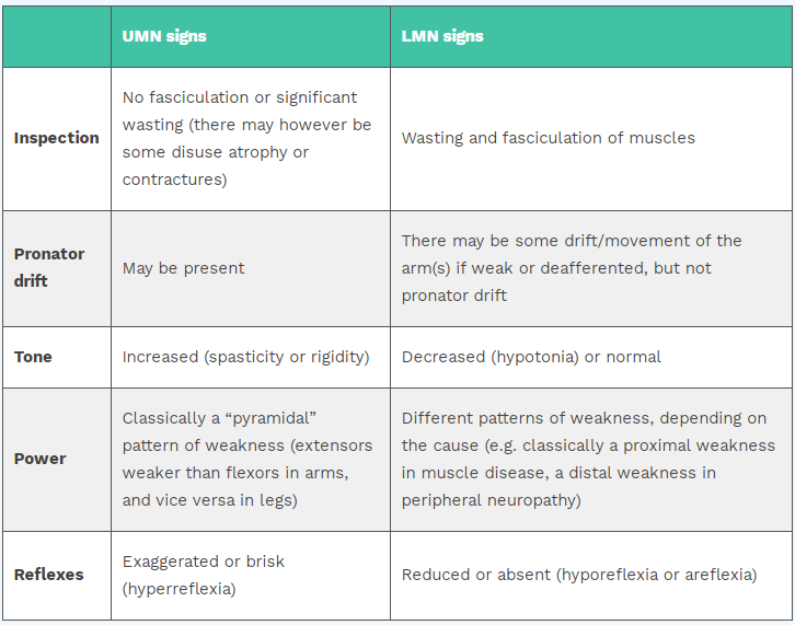 Compare UMN and LMN signs for following: