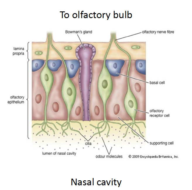 contian bipolar neurons –> apical pole carries a non-motile cilia with specific odorant binding receptors