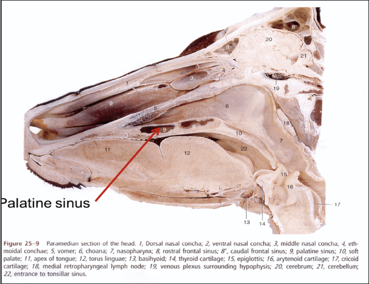 medially to form the palatine sinus and caudally forms the lacrimal bulla (protrudes into orbit)