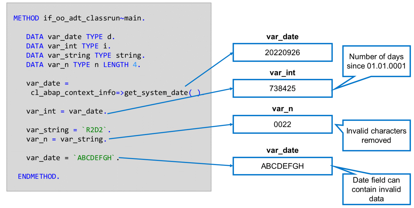 value assignments between variables of different data types are allowed. ABAP attempts to convert the value of the source field into the type of the target field. Whether the conversion is successful depends on whether the value of the source field is compatible with the data type of the target field.