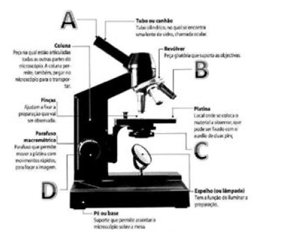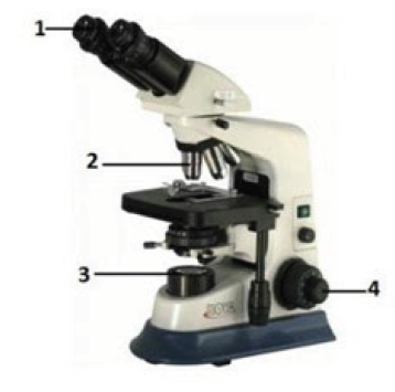 Que partes do microscópio estão indicadas pelos números 1, 2, 3 e 4,