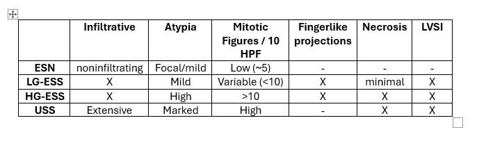 HG-ESS - exhibit high-grade nuclear atypia; infiltrative pattern similar to LG-ESS, more destructive growth pattern with extensive myometrial invasion, necrosis, and LVSI. Mitotic activity >10 / 10hpf