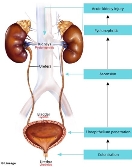Contamination of the periurethral area → colonizationof theurethra (urethritis)+ migration to the bladder