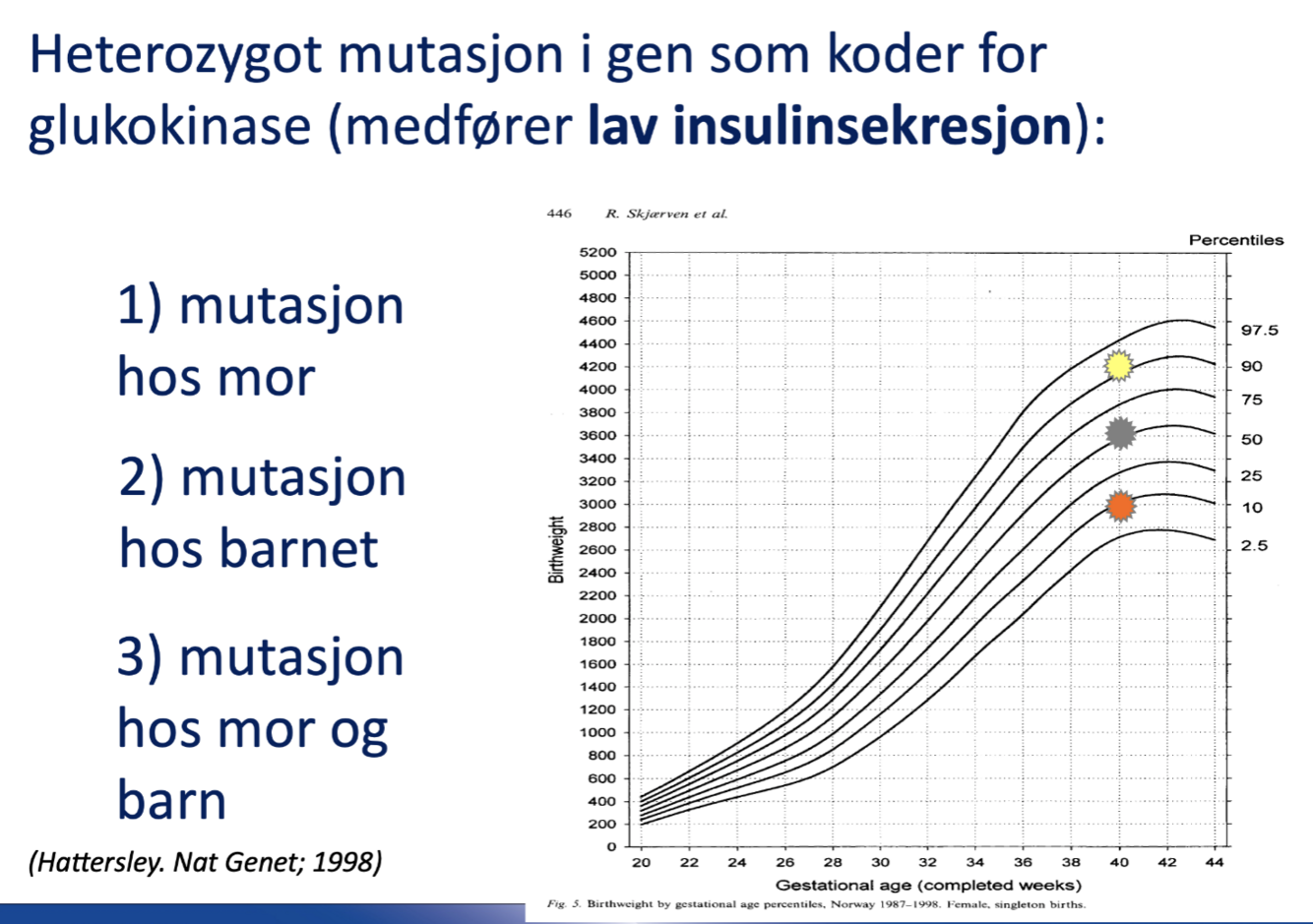 Mor har mild hyperglykemi (pga. GCK-mutasjon) → foster er normalt (uten mutasjon)
