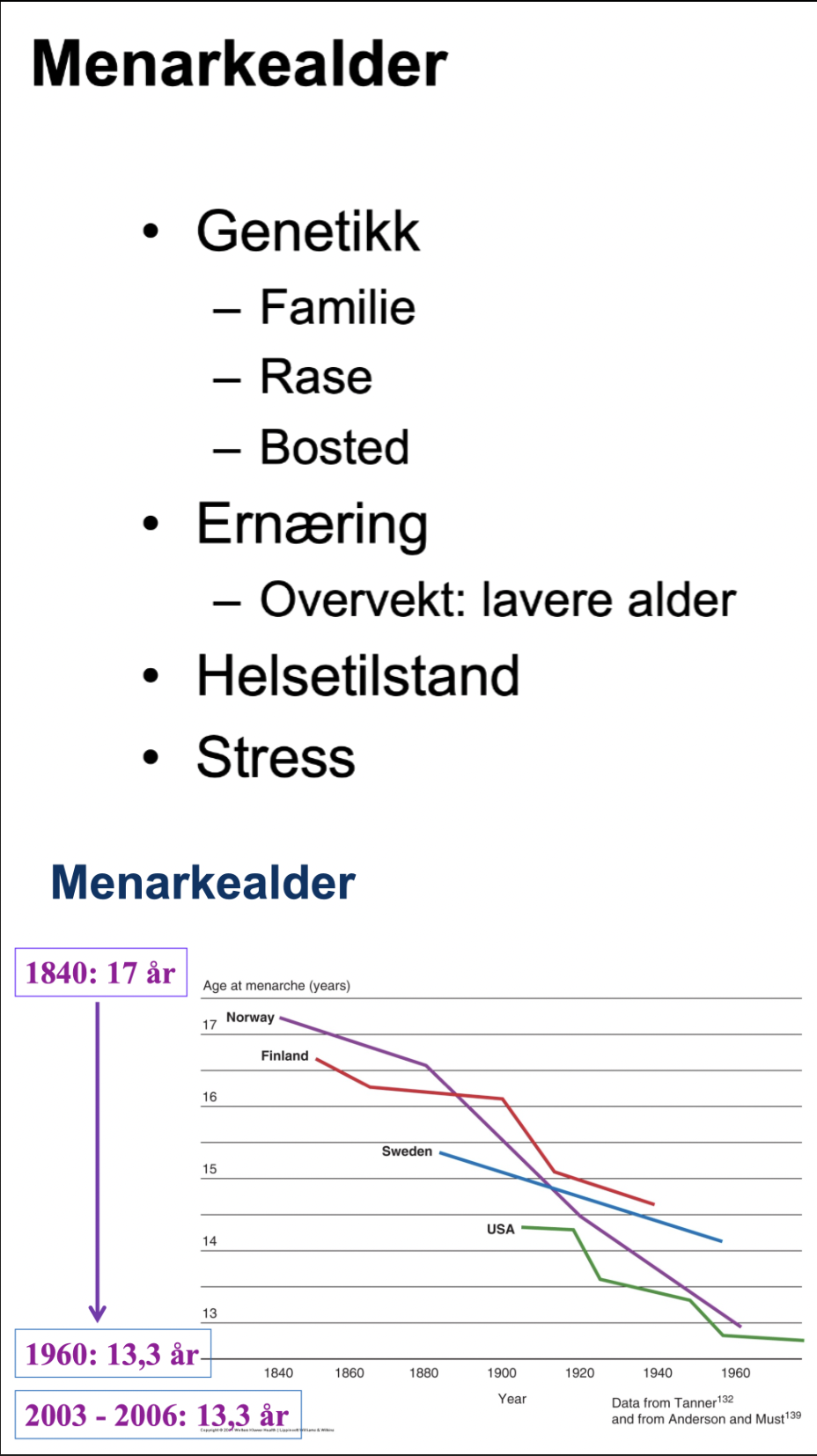 Selv om amerikanske data har gitt mistanke om tidligere menarke enn før (Herman-Giddens 97), har europeiske studier hittil ikke kunnet bekrefte dette (14, 26). Nederland 1997: 13,2 år, Danmark 1991 – 93: 13,4 år